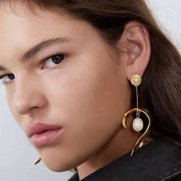 Add a touch of elegance to your look with the Temperament Trend Gold Color Metal Long Pearl Drop Earrings. Featuring a stunning combination of gold-tone metal and lustrous pearls, these earrings showcase a sophisticated, elongated design that gracefully dangles from the ear. The timeless elegance of the pearls, paired with the sleek gold accents, makes these earrings the perfect accessory for both formal occasions and chic evening events.